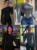 Step into the season with the ELORRAH Black Skew Collar Long Sleeve Tee, a chic blend of elegance and edge. Featuring an asymmetrical neckline that reveals just the right touch of allure, this versatile top redefines everyday sophistication.